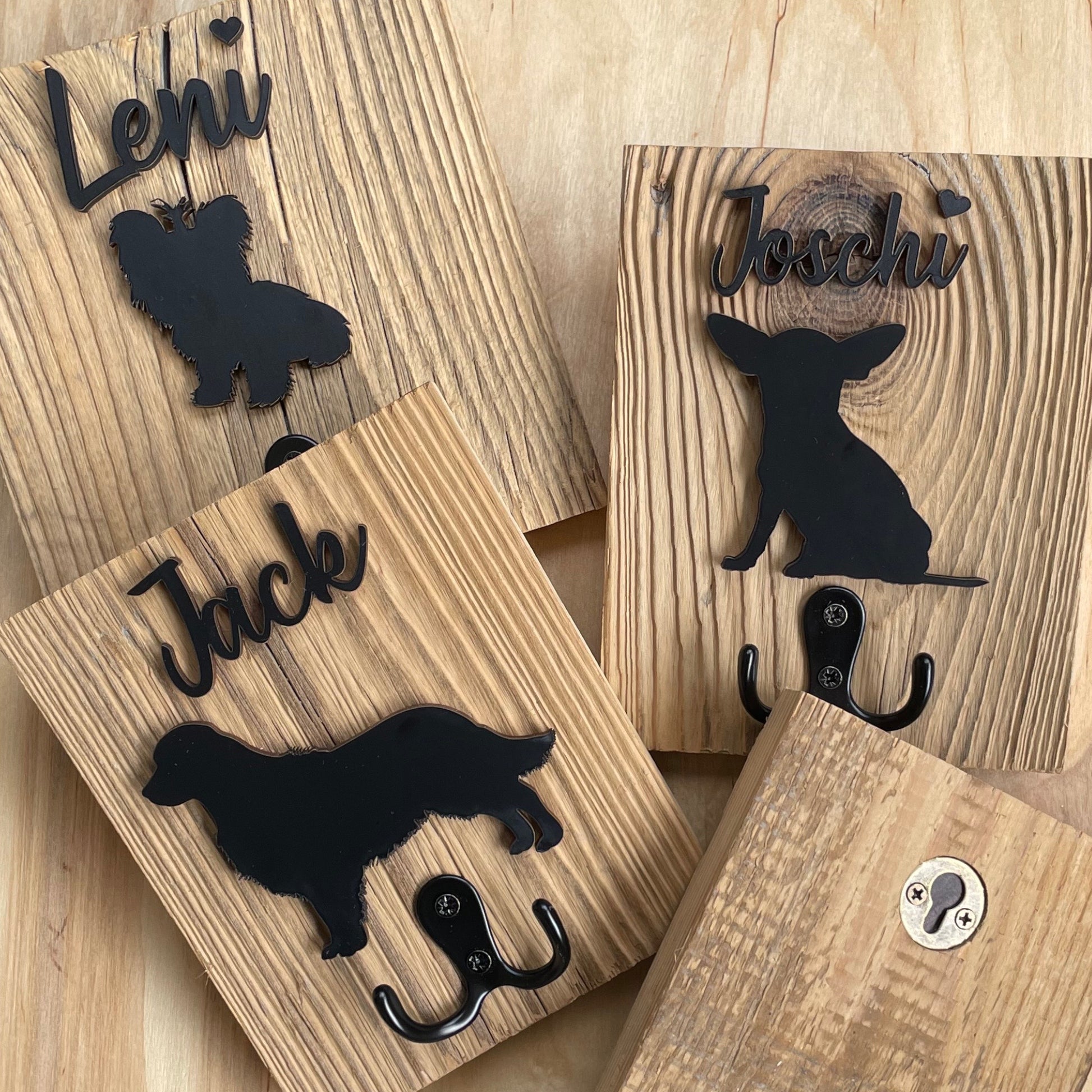 Gefertig wird unsere Hundegarderobe aus Altholz, welches durch seine individuelle Maserung und kleinen Astlöchern zum absoluten Einzelstück wird. Veredeln kannst du es mit der Silhouette deines Lieblings sowie dem Namen.