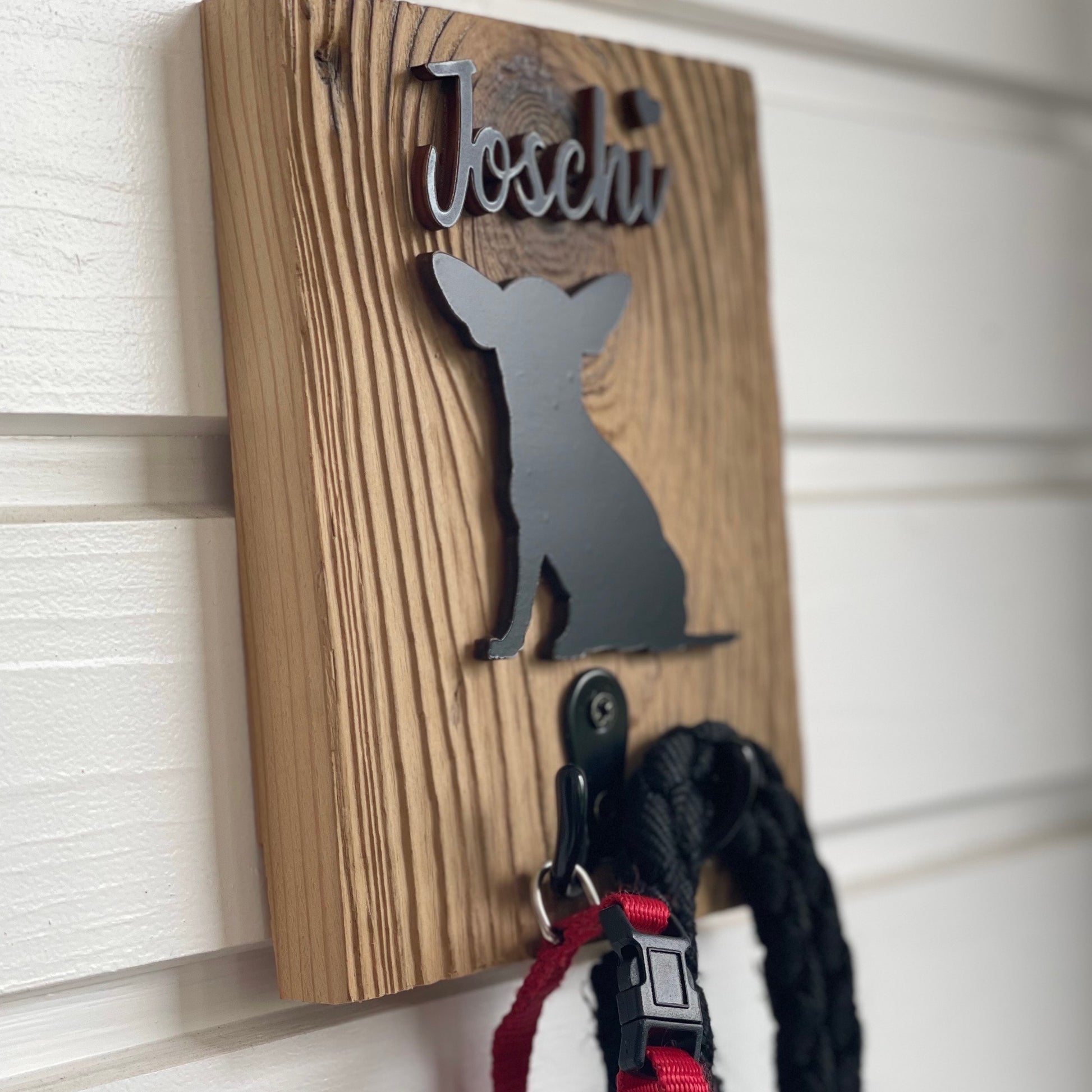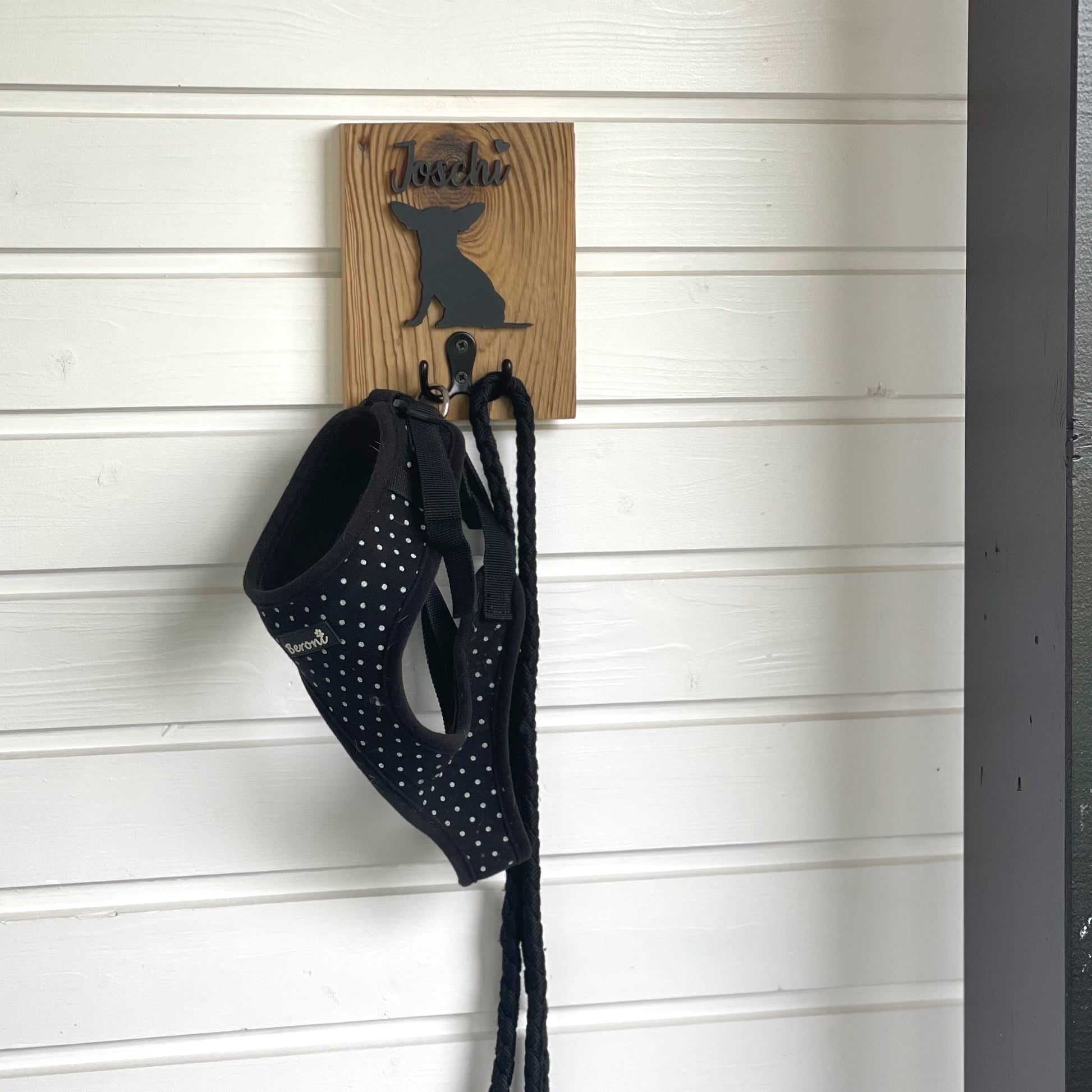 Mit unserer schicken Leinenhalterung ist Geschirr, Leine & Halsband immer an seinem Platz. Auch Hundepulli oder Futtersäckchen kannst du anhängen. So ist es jederzeit griffbereit und auch wenn Schwiegermama zum Gassigehen vorbeikommt, findet sie alles an Ort und Stelle.