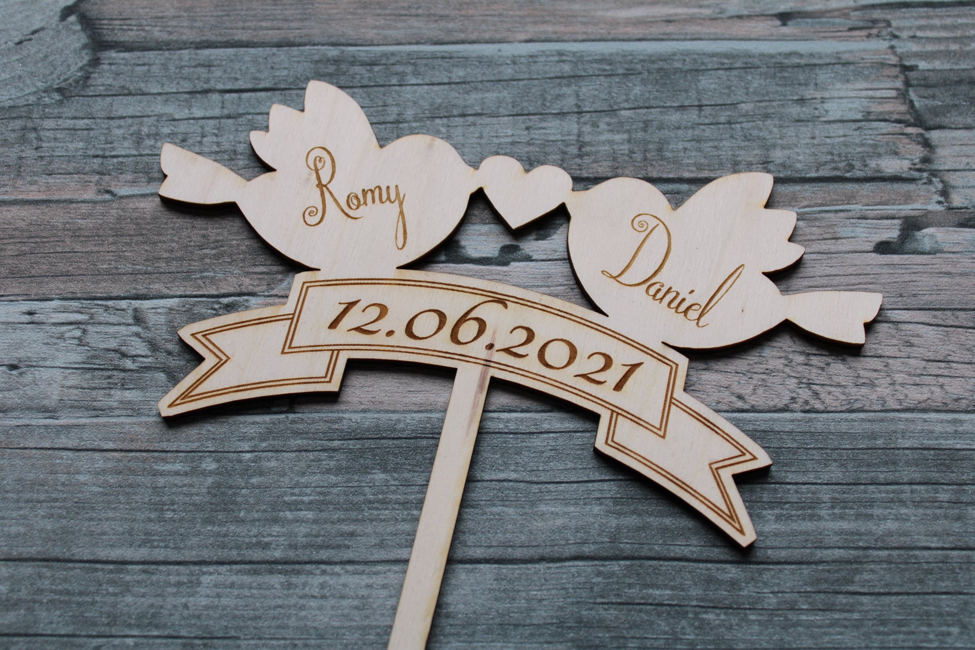 Dieser Caketopper eignet sich perfekt für die Hochzeitstorte. Eure zwei Namen werden in die Vögel eingraviert. Andere Abmessungen sind je nach Tortengröße auf Anfrage erhältlich.