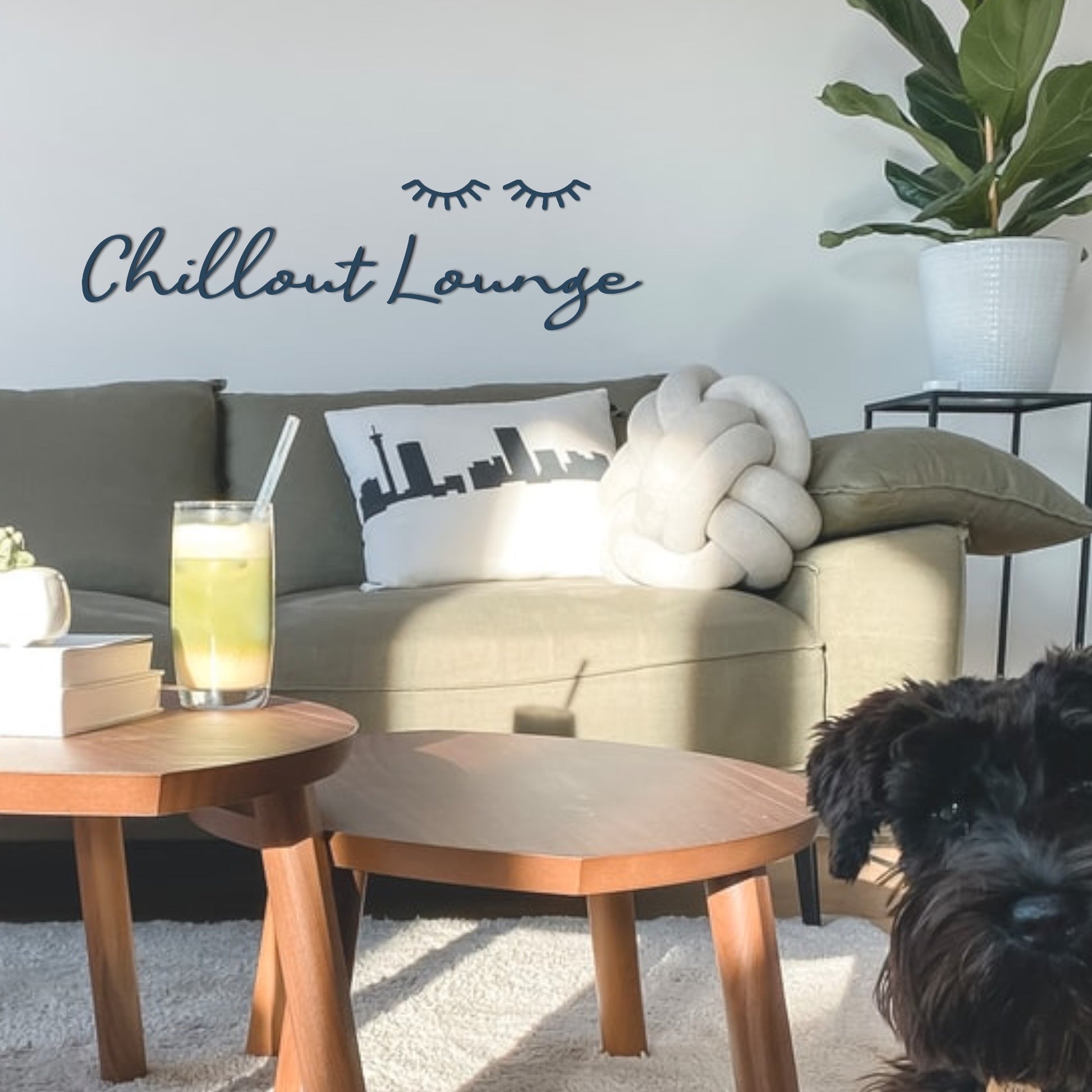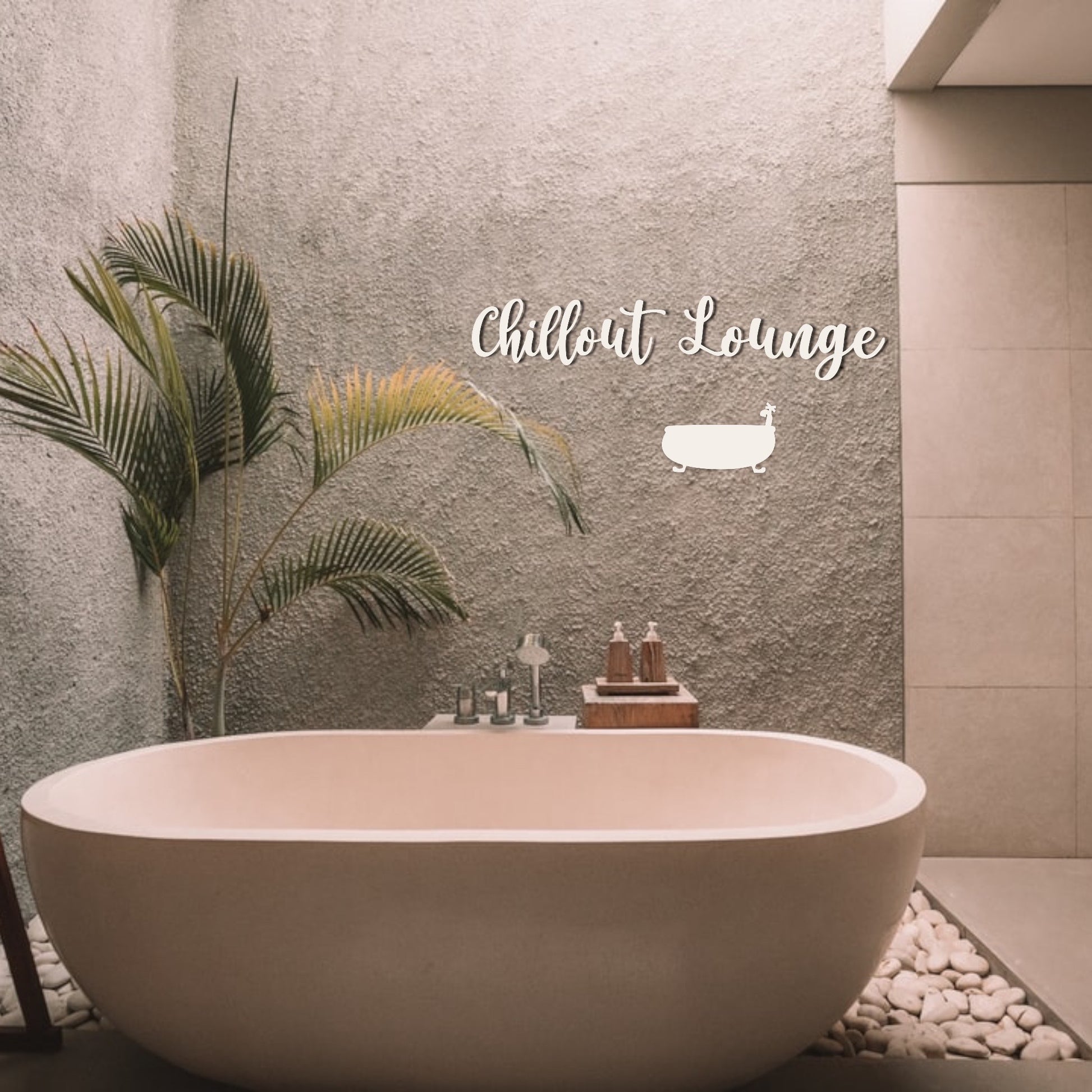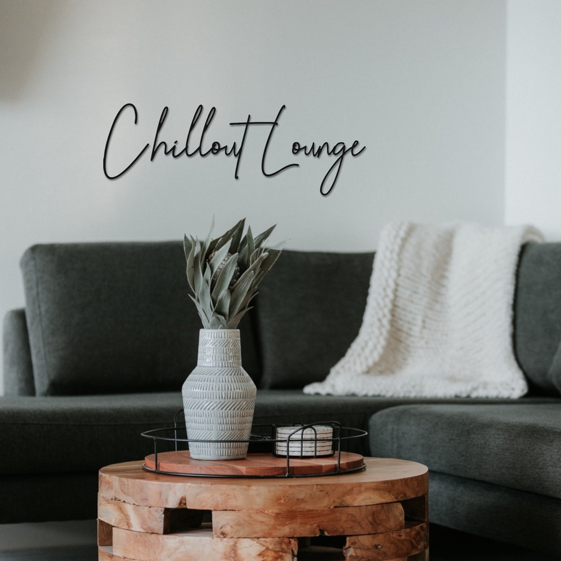 3D-Schriftzug "Chillout Lounge" aus Holz in verschiedenen Farben.