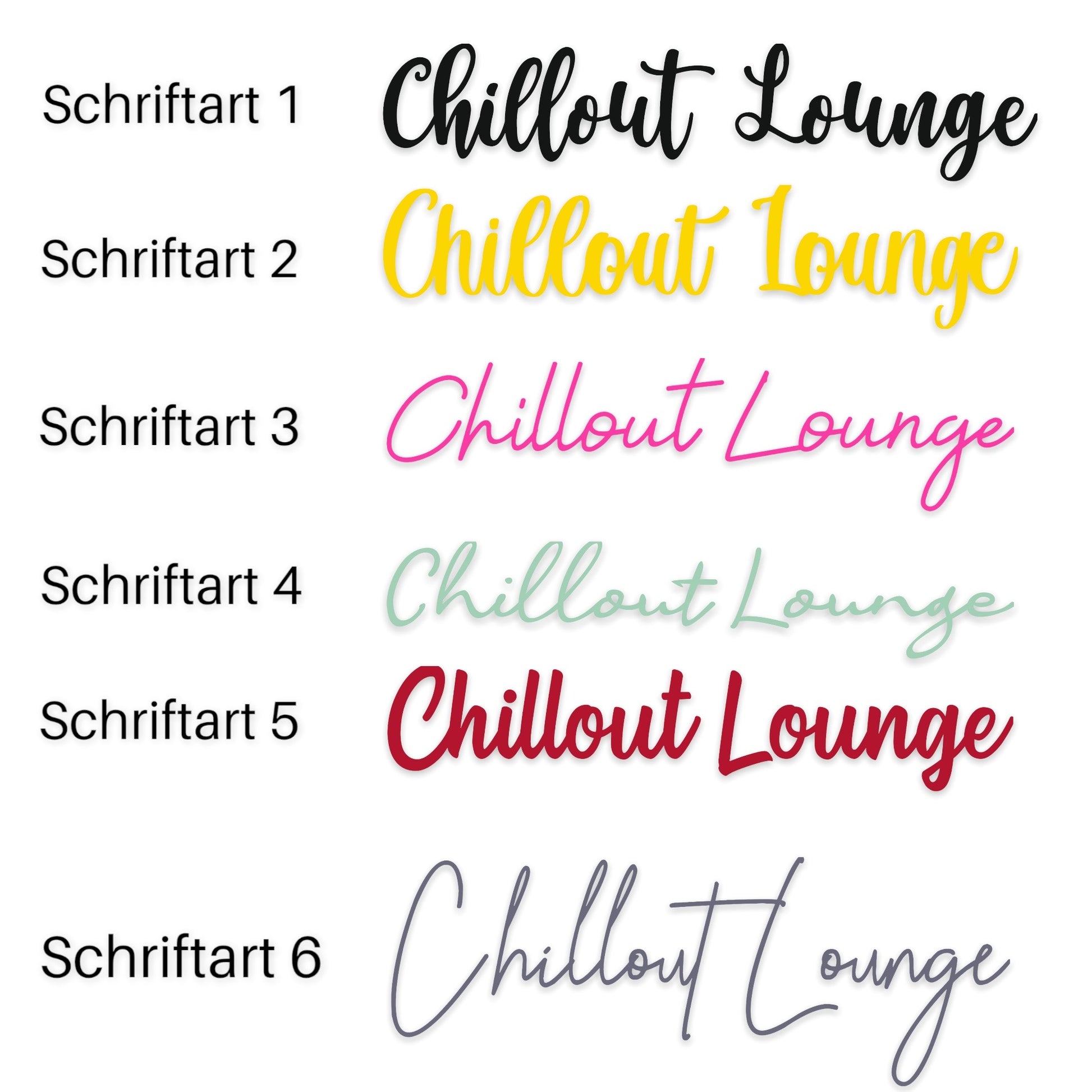 Schriftzug Chillout Lounge aus Holz in verschiedenen Farben und 6 Schriftarten