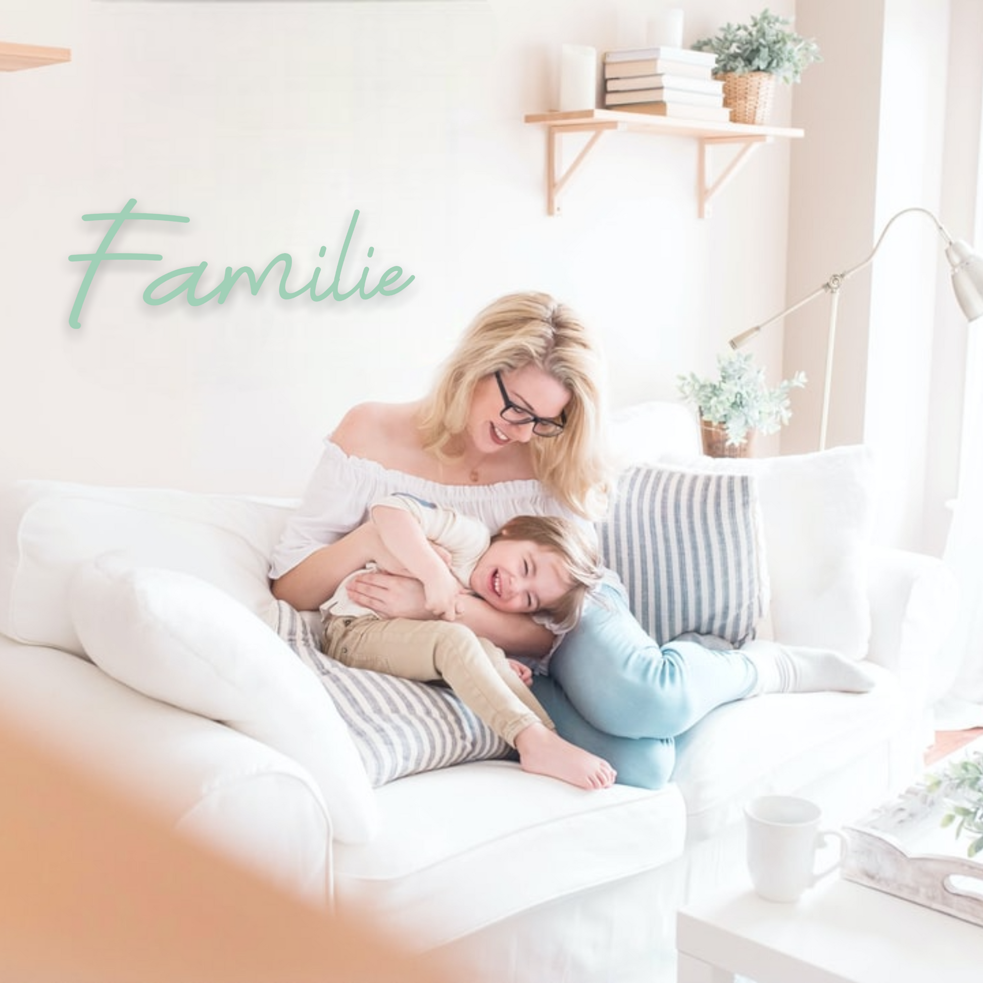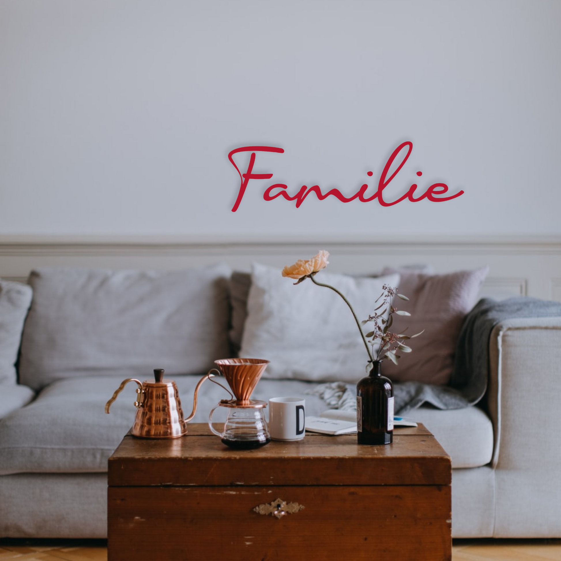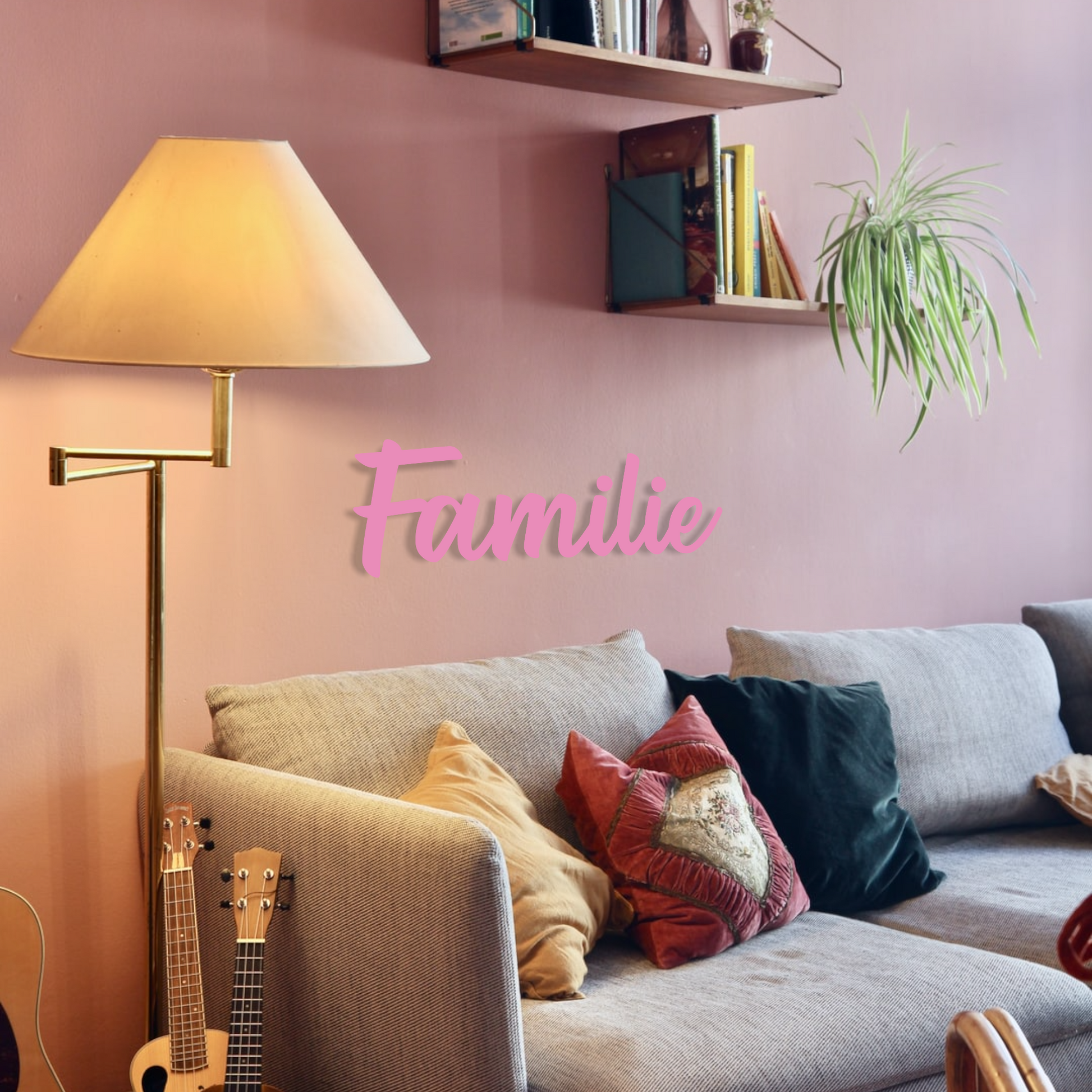 3D-Schriftzug "Familie" aus Holz in verschiedenen Farben.