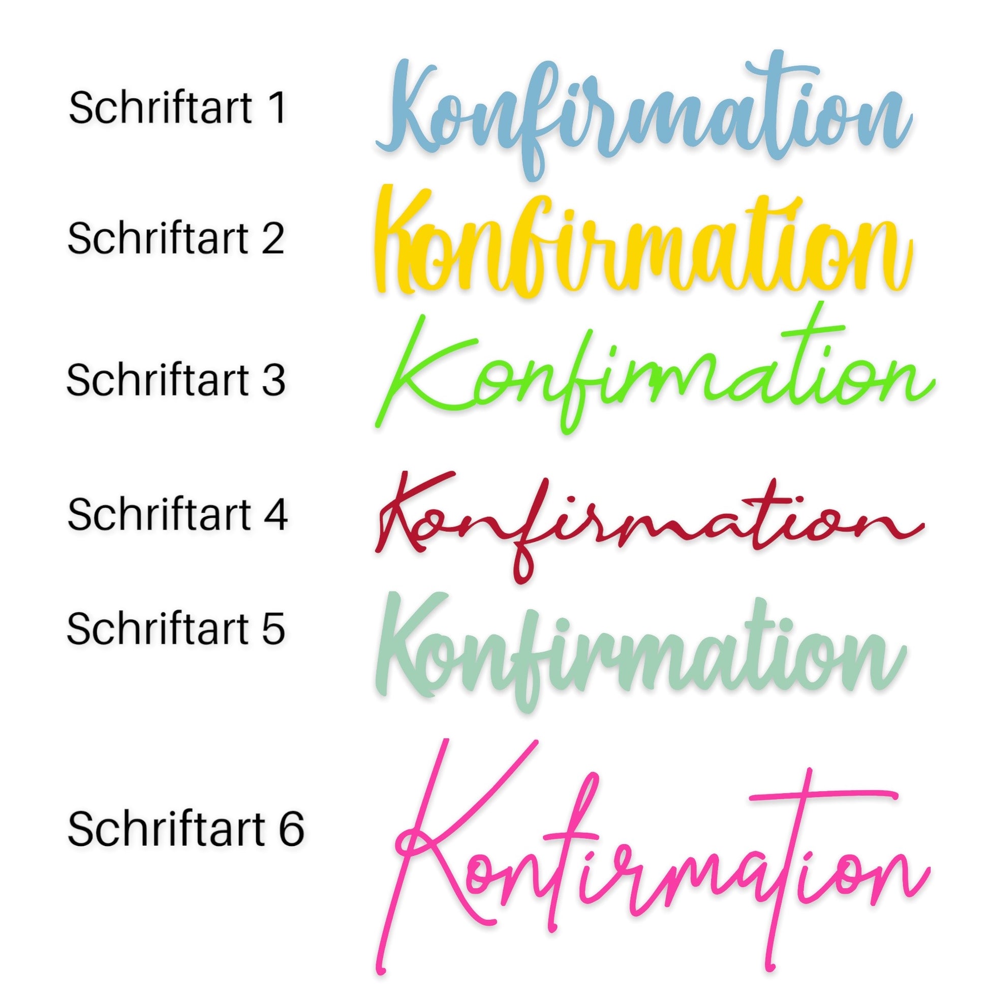 Schriftzug Konfirmation aus Holz in verschiedenen Farben und 6 Schriftarten
