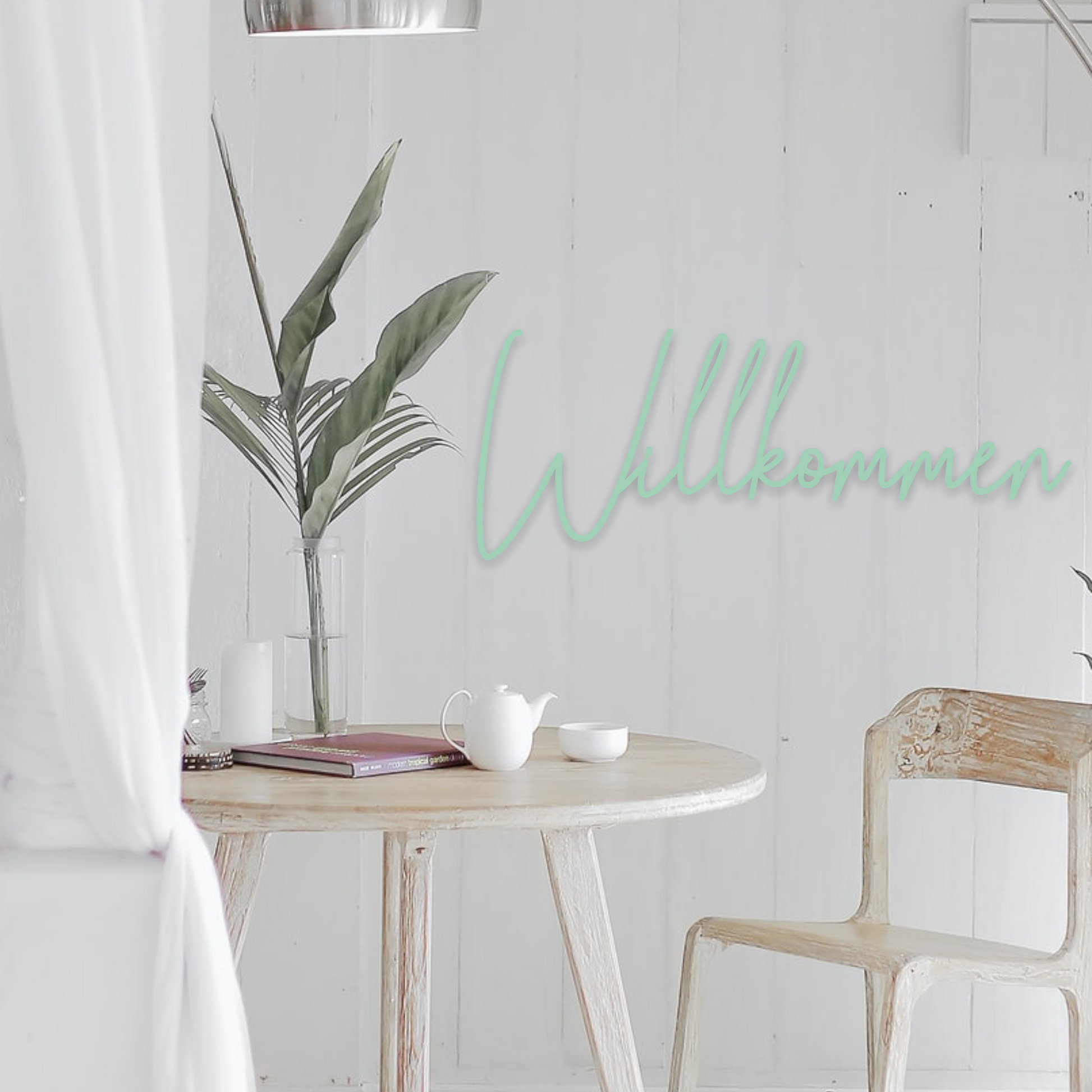 3D-Schriftzug "Willkommen" aus Holz in verschiedenen Farben.